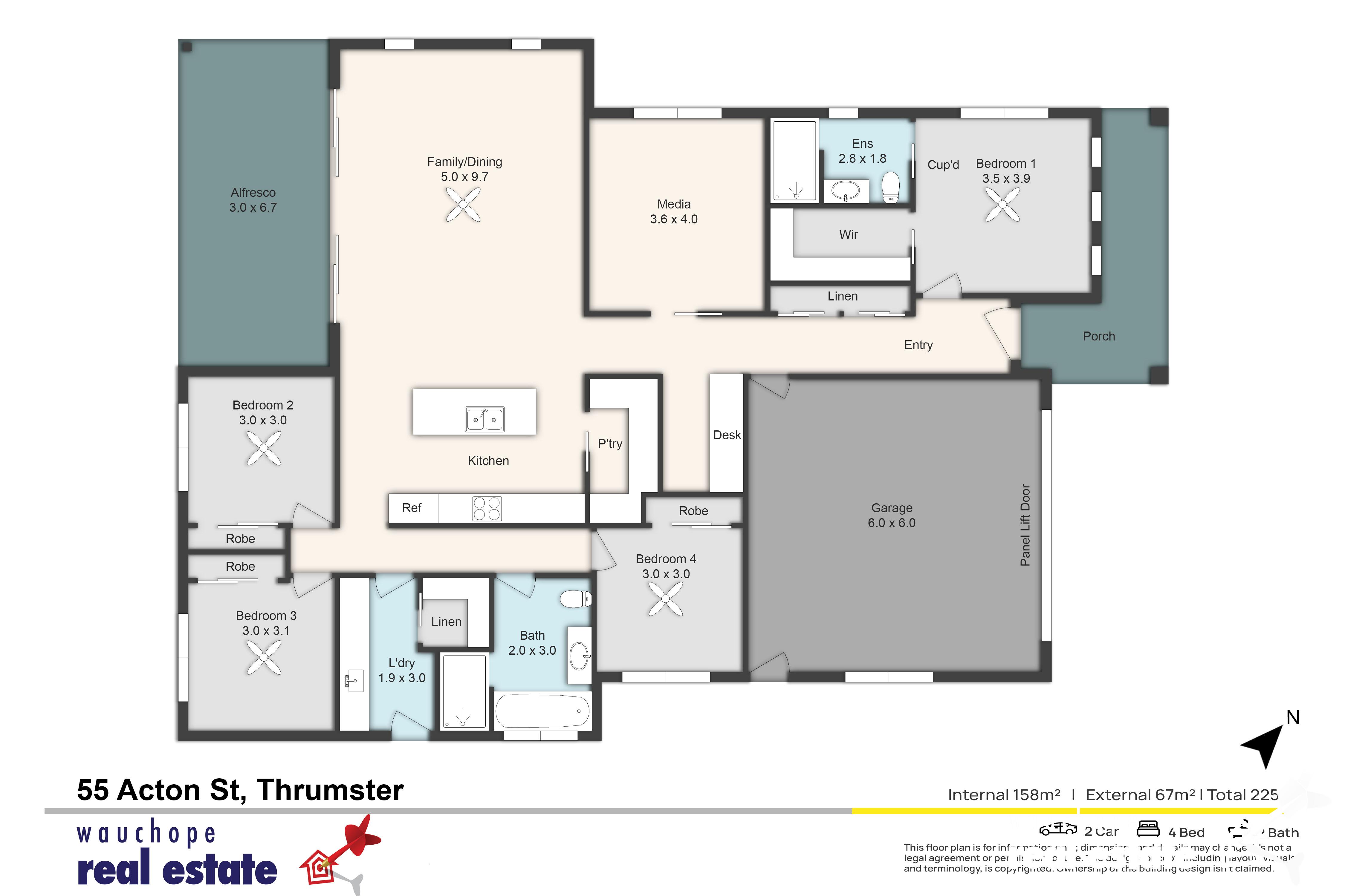 The master suite offers privacy, a ceiling fan, a fitted walk-in wardrobe and an ensuite. Three additional bedrooms are located at the rear, all with ceiling fans and built-in wardrobes - ideal for family or guests.
